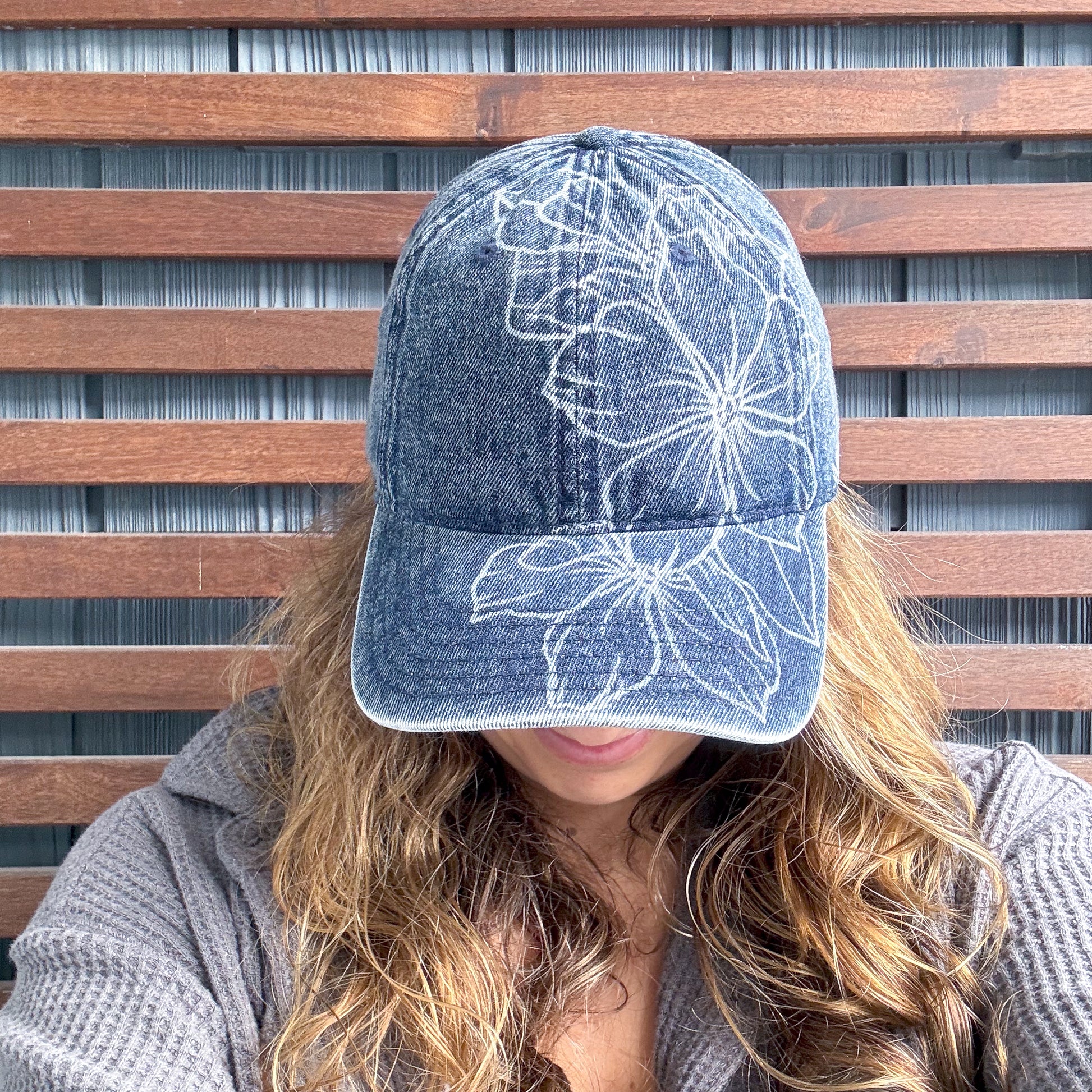 Denim Hand Drawn Wild Flower Adjustable Baseball Cap