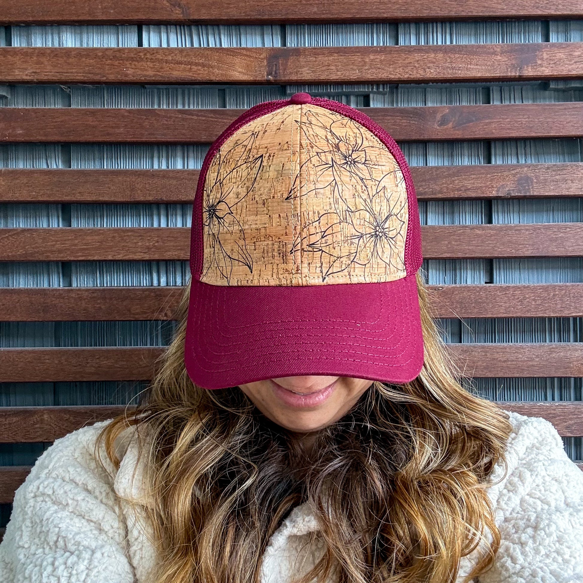Red Hand Drawn Floral Cork Curved Brim Trucker Hat