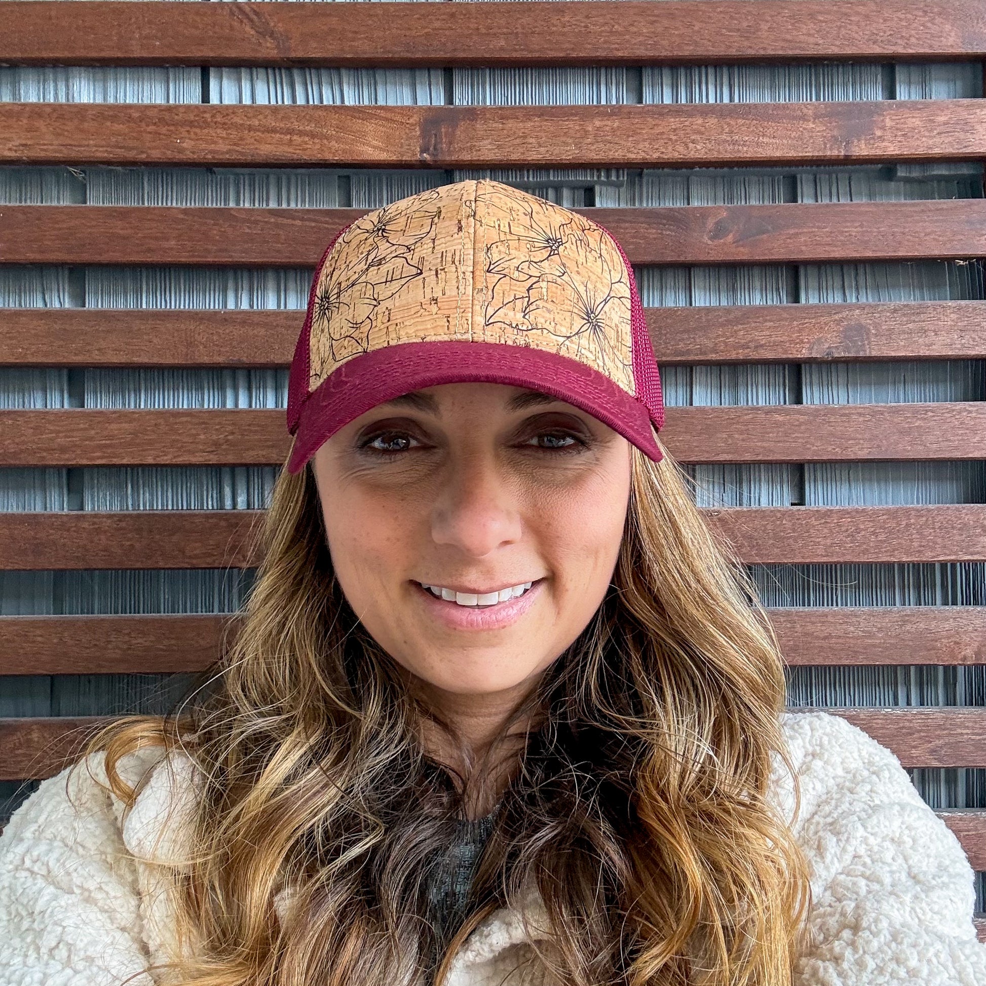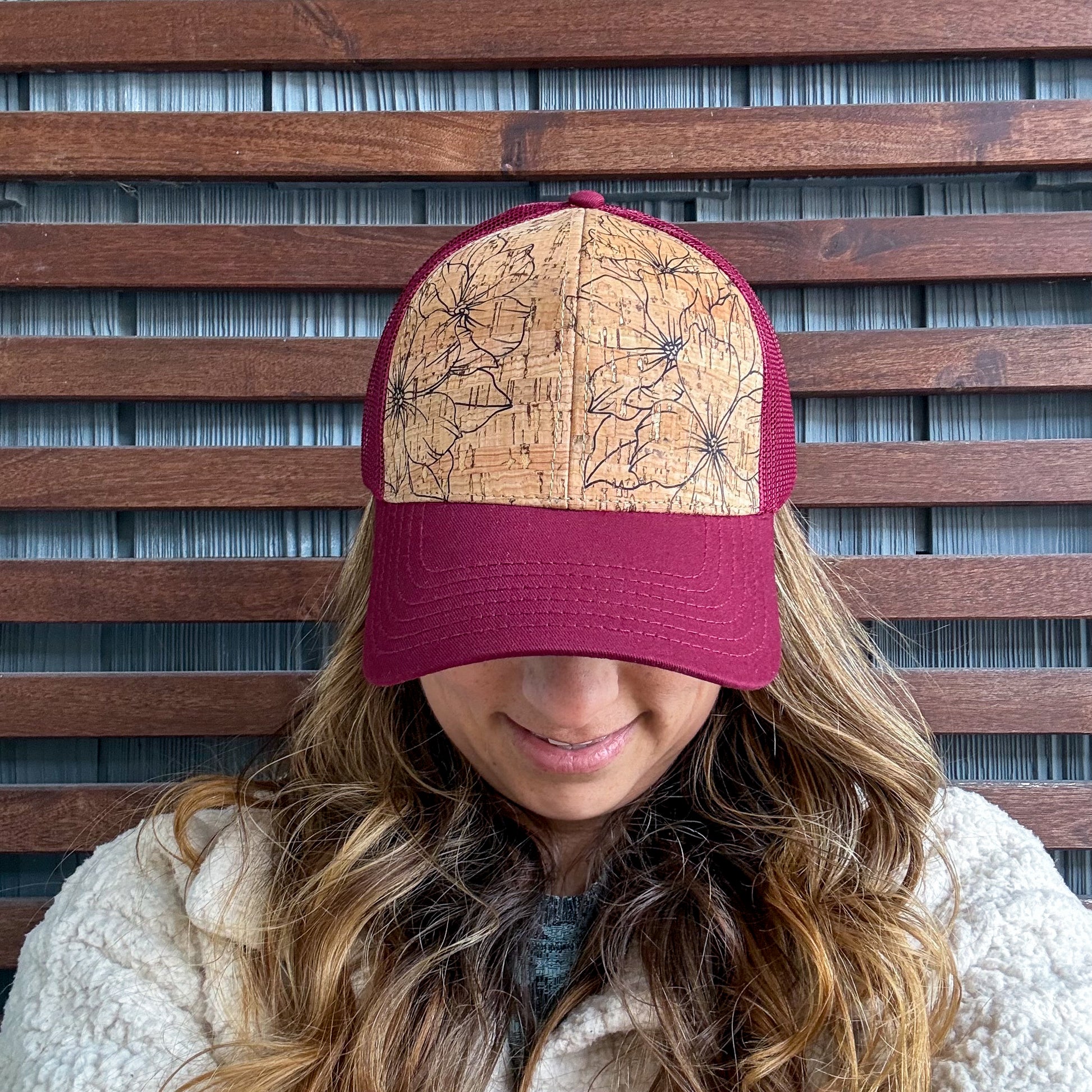 Red Hand Drawn Wild Flower Floral Cork Curved Brim Trucker Hat